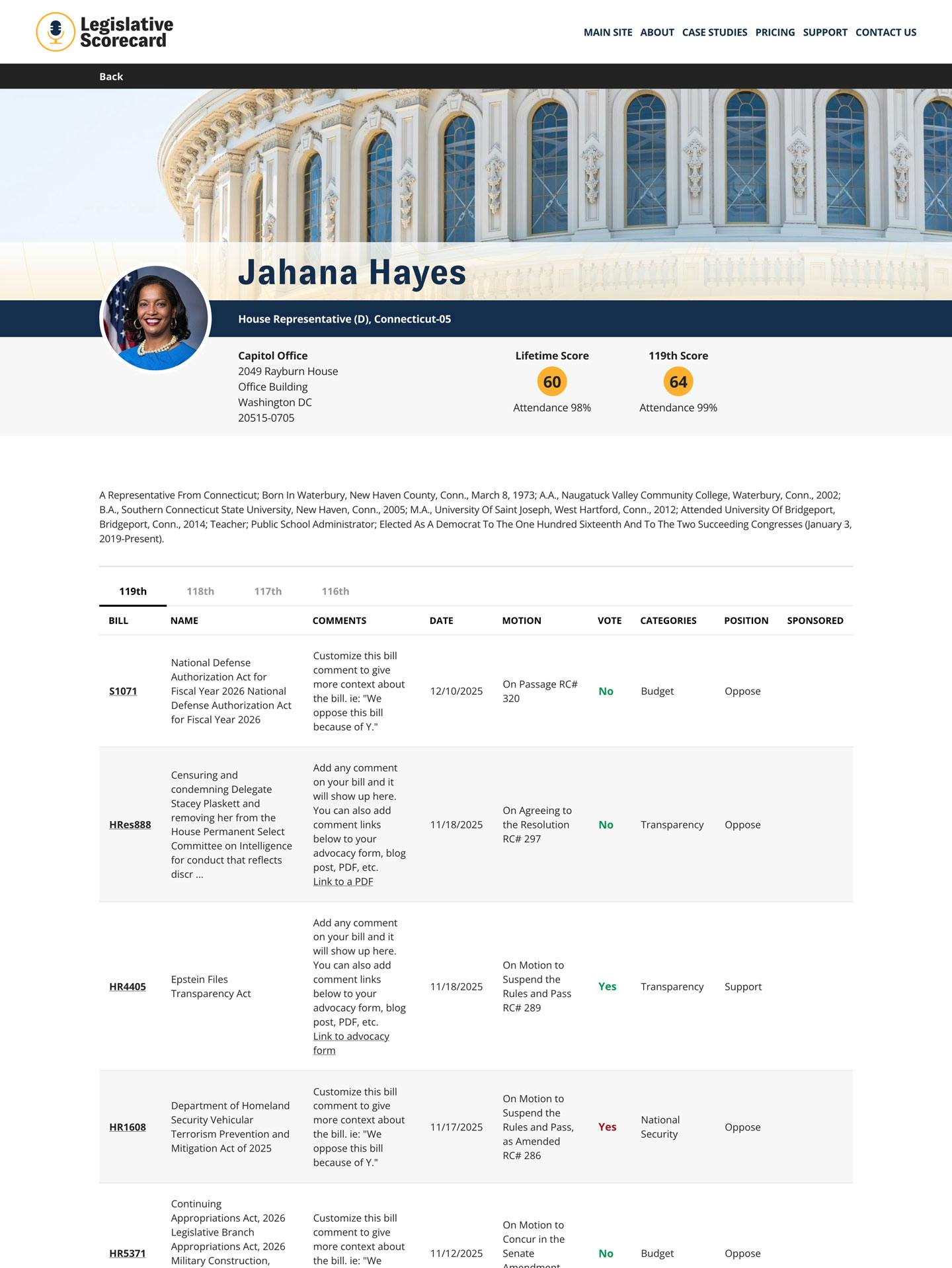 Our platform transforms complex vote records and bill data into clear insights that constituents, advocates, and stakeholders can trust.